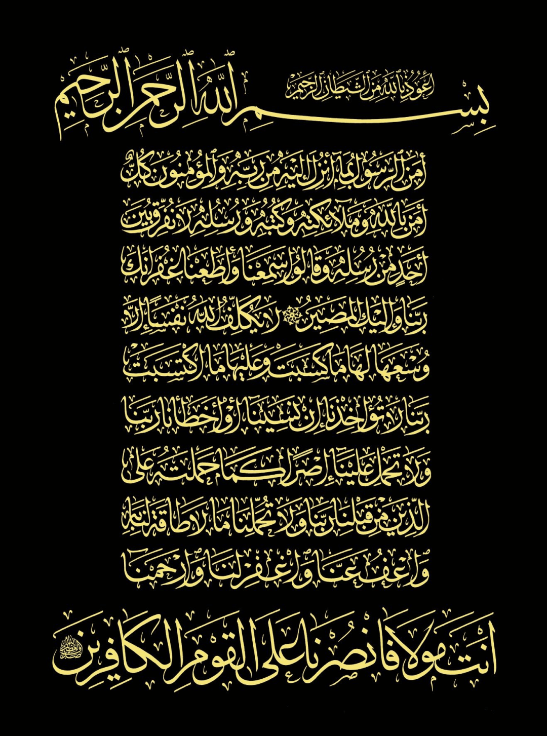 لَا يُكَلِّفُ اللَّهُ نَفْسًا إِلَّا وُسْعَهَا لَهَا مَا كَسَبَتْ وَعَلَيْهَا مَا اكْتَسَبَتْ رَبَّنَا لَا تُؤَاخِذْنَا إِن نَّسِينَا أَوْ أَخْطَأْنَا رَبَّنَا وَلَا تَحْمِلْ عَلَيْنَا إِصْرًا كَمَا حَمَلْتَهُ عَلَى الَّذِينَ مِن قَبْلِنَا رَبَّنَا وَلَا تُحَمِّلْنَا مَا لَا طَاقَةَ لَنَا بِهِ وَاعْفُ عَنَّا وَاغْفِرْ لَنَا وَارْحَمْنَا أَنتَ مَوْلَانَا فَانصُرْنَا عَلَى الْقَوْمِ الْكَافِرِينَ